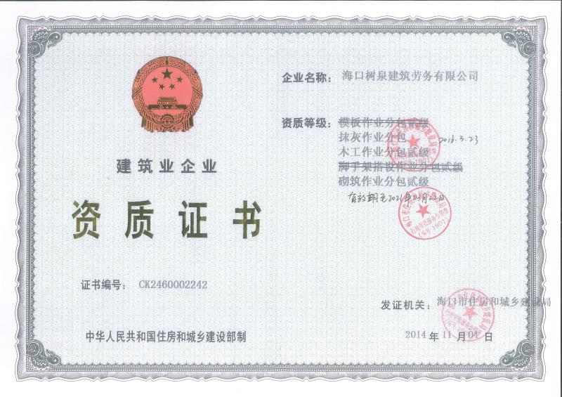 ??跇?shù)泉建筑勞務(wù)有限公司成立于2011年,公司位于海口,其前身是一家專(zhuān)業(yè)建筑施工隊(duì),自2004年即開(kāi)始在海南從事建筑勞務(wù)施工。自成立至今,公司已經(jīng)擁有一支科學(xué)管理、質(zhì)量過(guò)硬、能打硬仗,搶工期的專(zhuān)業(yè)隊(duì)伍。能獨(dú)立承擔(dān)大中型工業(yè)與民用建筑 、室內(nèi)外裝修、各類(lèi)機(jī)電設(shè)備安裝工程。代表工程有??跒I海華庭、三亞時(shí)代海岸T01/02/04/05棟高層、合肥東海花園二期、陵水富力灣B區(qū)高層、三亞金中海(酒店)、瓊海大印經(jīng)典花園、??诃h(huán)球海景大酒店(四星級(jí)酒店,在建中)、陵水珍珠大廈(五星酒店)、??谌f(wàn)達(dá)廣場(chǎng)、美蘭機(jī)場(chǎng)二期。